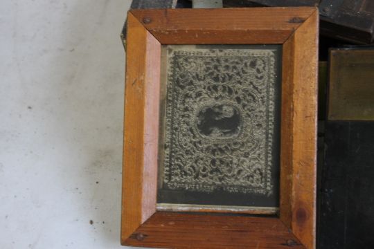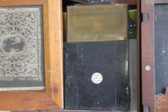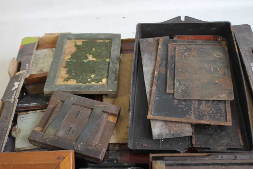A TRAY OF ASSORTED VINTAGE PHOTOGRAPHIC PLATE HOLDERS AND PLATES, assorted sizes