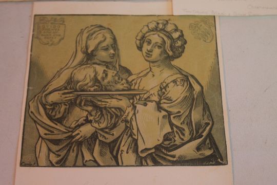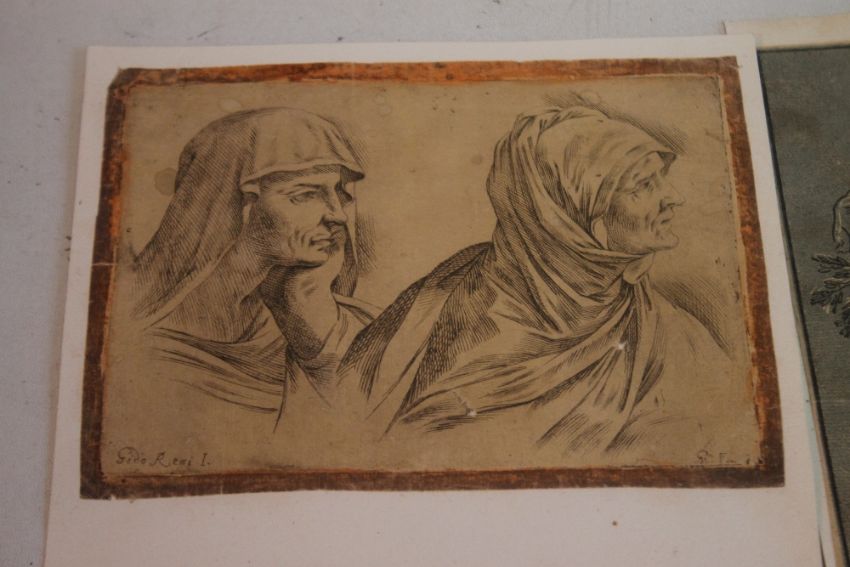 THREE PRINTS AFTER GUIDO RENI - one etching of two figures, bottom left is "Gido Reni I", two wood cuts - one has bottom left "Guido Rhenus Bonon. Inuen. Bart. Coriolanus Eq. Sculp." , the other has top left "Guido Rhenus Bon. In. Bart. Cor. Eques. F." and bottom left "1632 Corio.s.", all three are laid on stiff paper