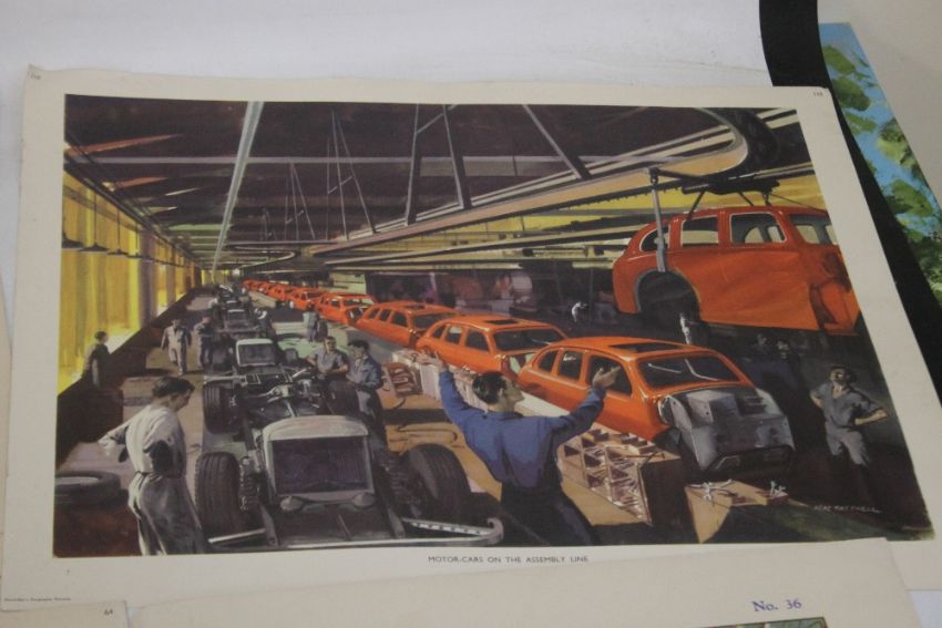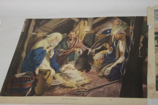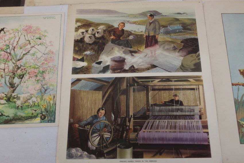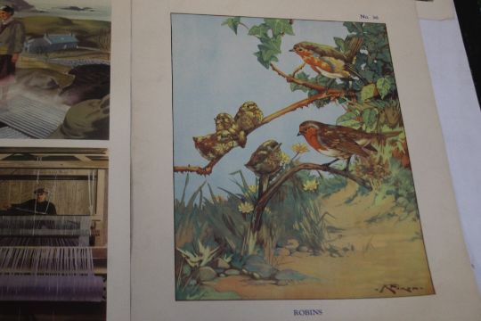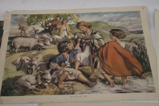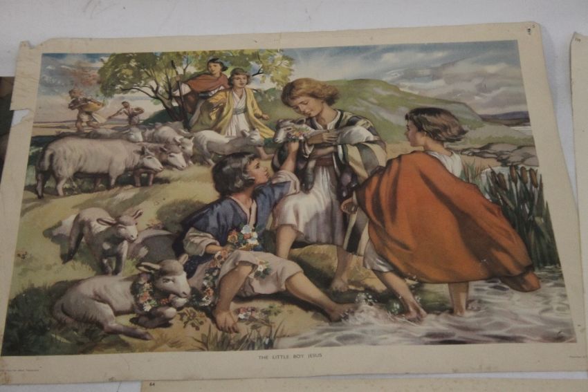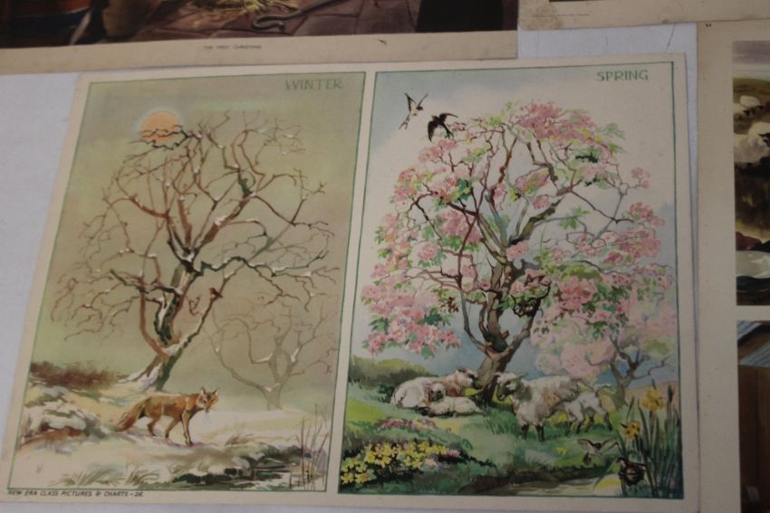 A FOLDER OF SCHOOL PICTURES, POSTERS to include New Era Class Pictures and Charts (2), Macmillan's Geography Pictures (18), Enid Blyton Bible Pictures (1 - 30 but first five trimmed/cut down) and eight nature related, (total approx. 58)
