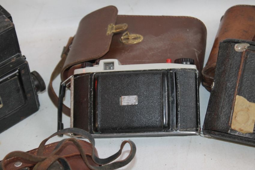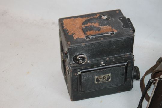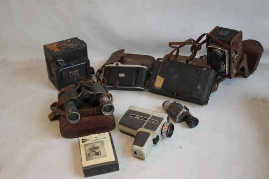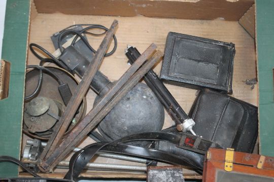 A TRAY OF ASSORTED VINTAGE PHOTOGRAPHIC EQUIPMENT to include an Ensign Reflex, pair of cased binoculars A/F