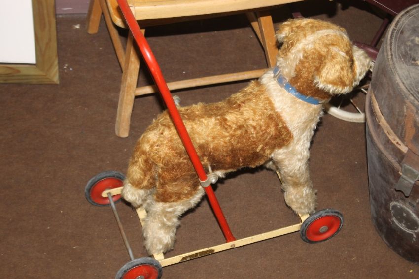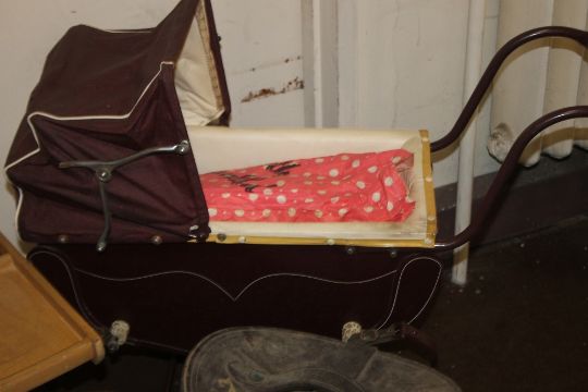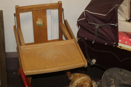 A COACH BUILT DOLLS PRAM with bedding and cover, together with a push-along dog and a 1950s child's potty chair (3)