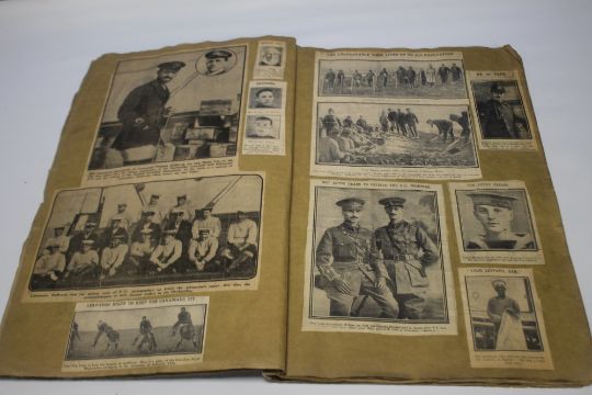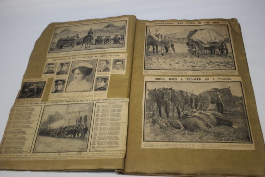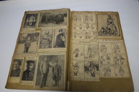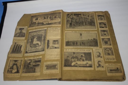 A WWI INTEREST SCRAP BOOK, dated January 20th 1915 to cover containing numerous illustrated newspaper clippings to include "Ned Kelly suits for soldiers", "Australians march past at foot of the pyramids", "The Hun finds pleasure in demolishing historic buildings"