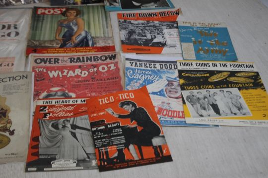 FILM MAGAZINES AND MEMORABILIA TO INCLUDE 1966 Doctor Zhivago Calendar, "Picture Post" with Sophia Loren cover January 1956, "Picturegoer" with Kim Novak cover July 1957, "Picture Show & Film Pictorial" July 1957, August 1957, October 1957, December 1957, "The Modern Boy's Film Star Album" with Will Hay cover, souvenir booklet for the Cecil B. DeMille film "The Ten Commandments", "Picture Show Art Supplement" February 1931 "The Blue Angel" together with film related sheet music including Judy Garland's "Over The Rainbow" and two Disney pieces