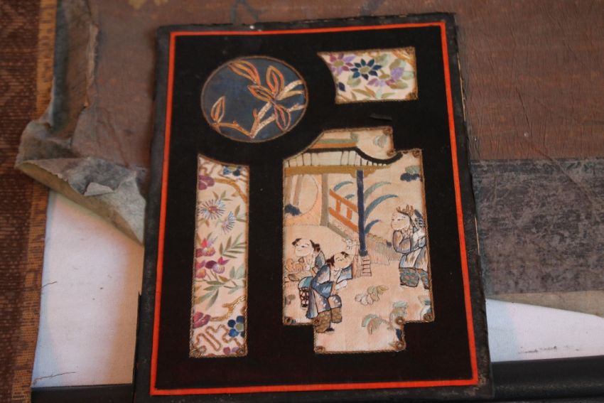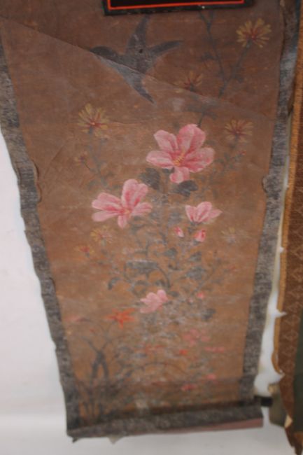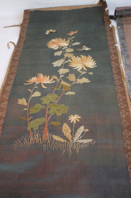 AN ORIENTAL SCROLL WITH EMBROIDERED DECORATION OF FLOWERS AND BUTTERFLIES, together with a painted example of flowers and a small embroidered panel