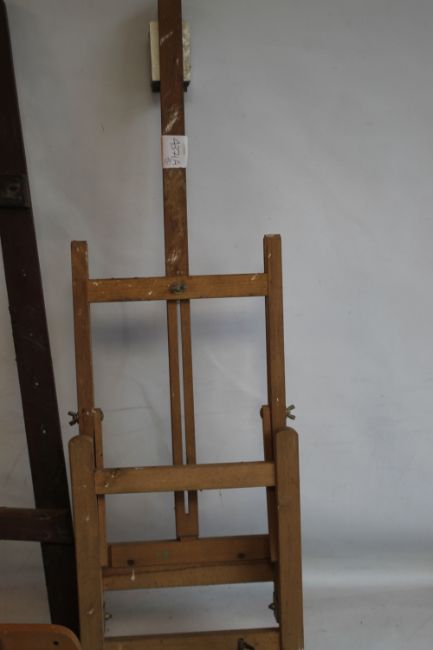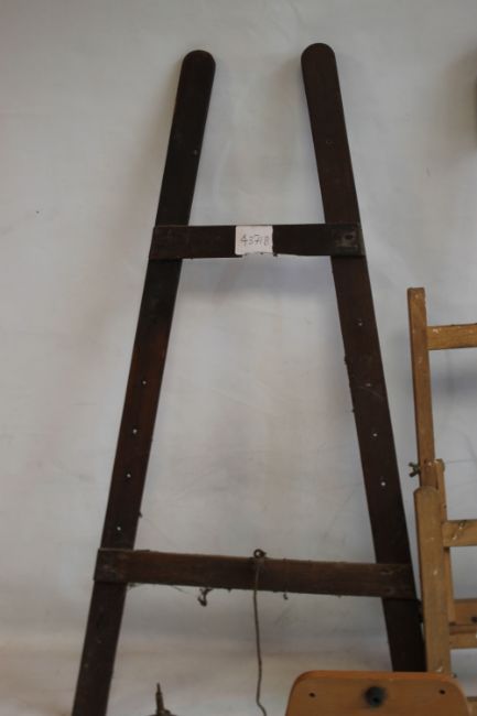 A SMALL ADJUSTABLE WOODEN ARTIST'S EASEL, H 85 cm, together with another slightly larger easel and a film winder (3)