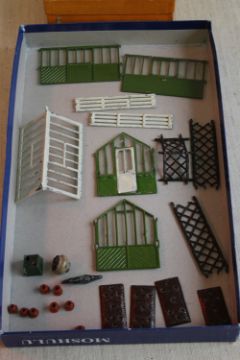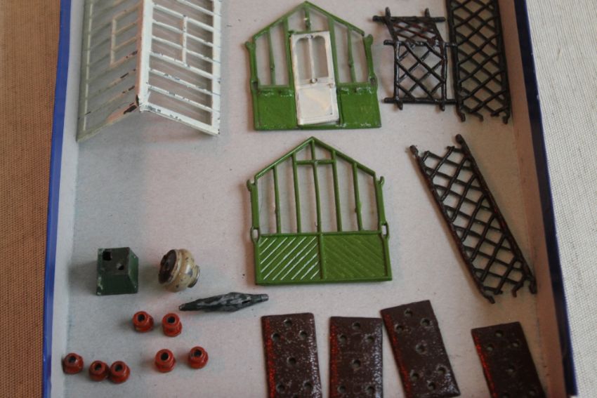 A BOXED BRITAIN'S MINIATURE GARDENING SPAN ROOF GREENHOUSE No. 053, pieces wrapped in newspaper dated 1947 with miniature flower beds and pots