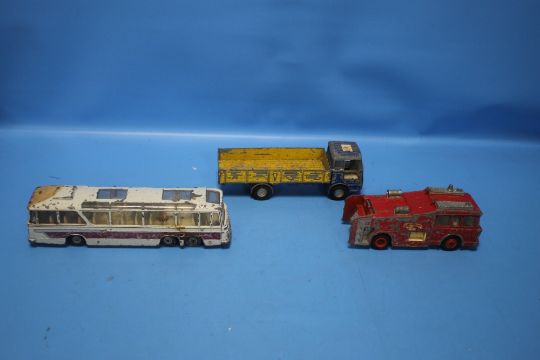 SEVEN MIXED DINKY VEHICLES to include Aveling Baford Centaur Dump truck, Vega Major luxery coach, Mercedes Benz LP 1920, ERF fire tender and three others