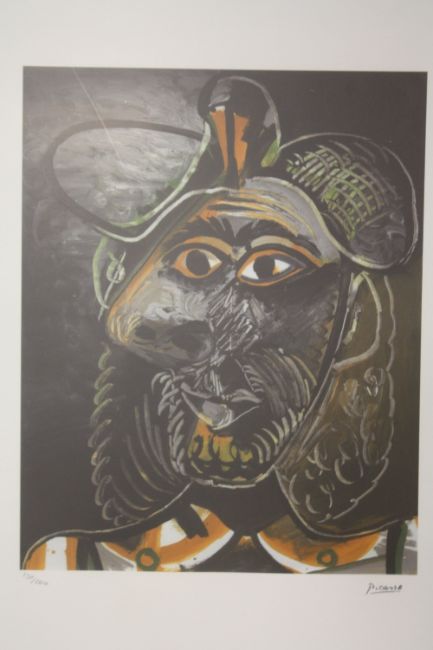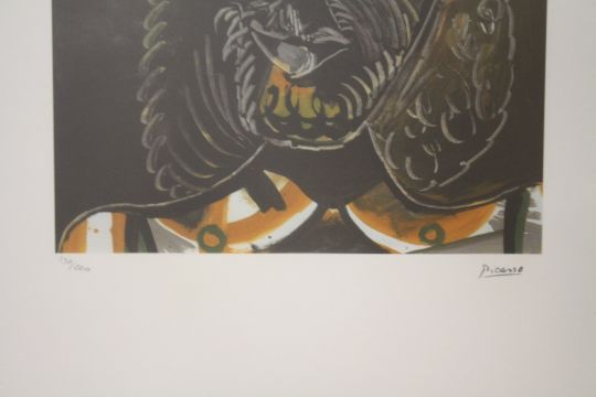 A FRAMED AND GLAZED LIMITED EDITION PICASSO ABSTRACT PORTRAIT STUDY PRINT 130/200 WITH BLIND STAMP LOWER LEFT SIZE - 36CM X 45.5CM