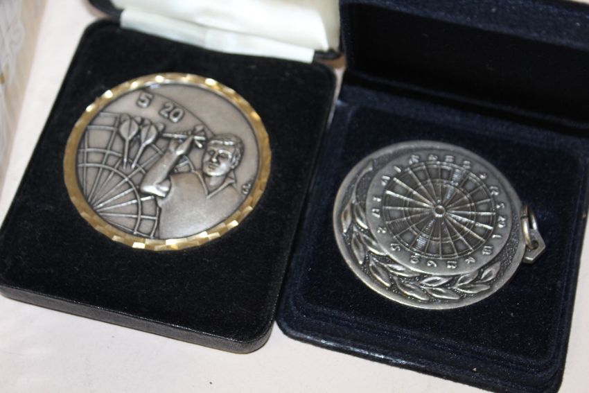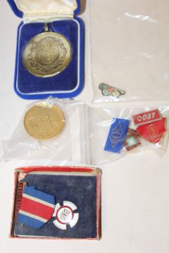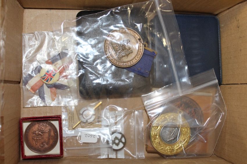 A BOX OF COLLECTABLES TO INCLUDE WORCESTER BEACON RACE MEDALS, PIN BADGES ETC.