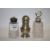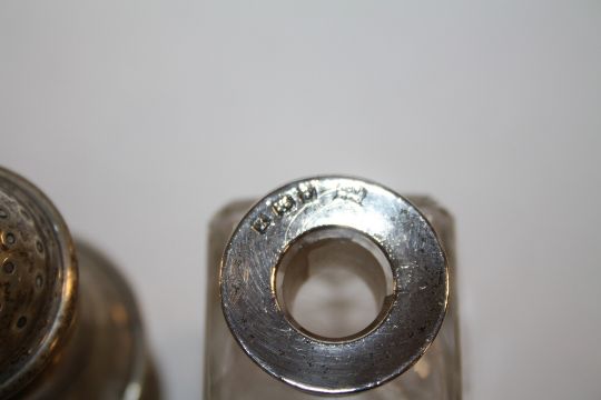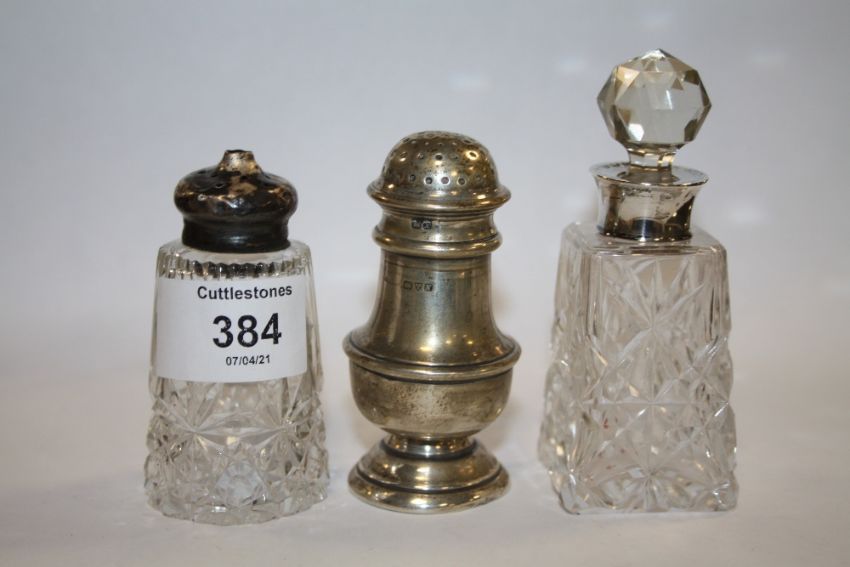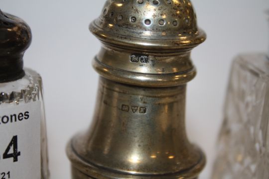 A HALLMARKED SILVER PEPPERETTE TOGETHER WITH A SILVER COLLARED SCENT BOTTLE AND ANOTHER (5)
