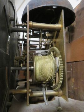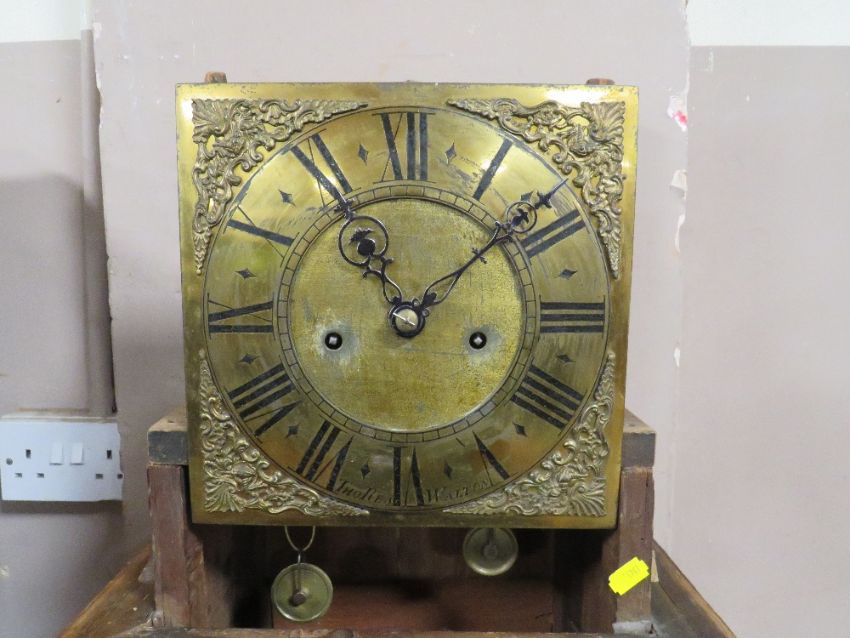 A 19TH CENTURY OAK EIGHT DAY LONGCASE CLOCK BY THO. REA - WALTON 10" BRASS DIAL, TWIN WEIGHT AND PENDULUM H-192 CM