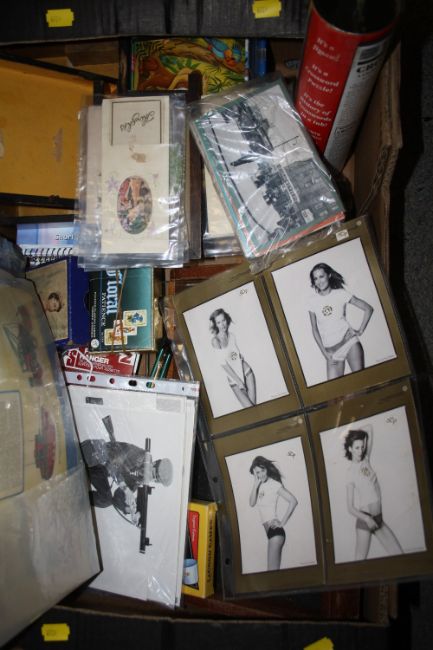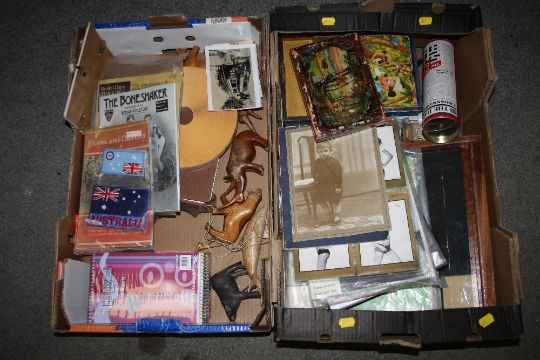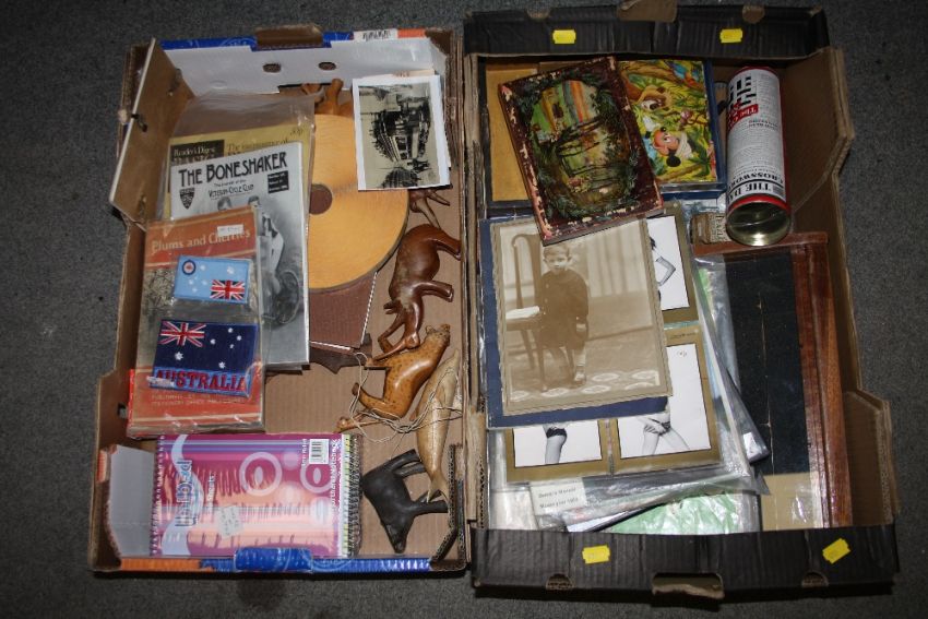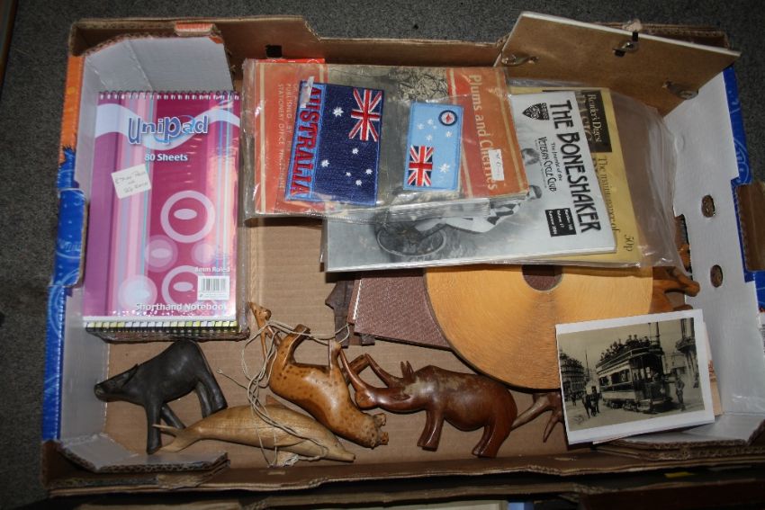 TWO TRAYS OF COLLECTABLES TO INCLUDE A SMALL DISPLAY CABINET AUSTRALIAN MILITARY ARM BAND, WOODEN ANIMAL FIGURES ETC.