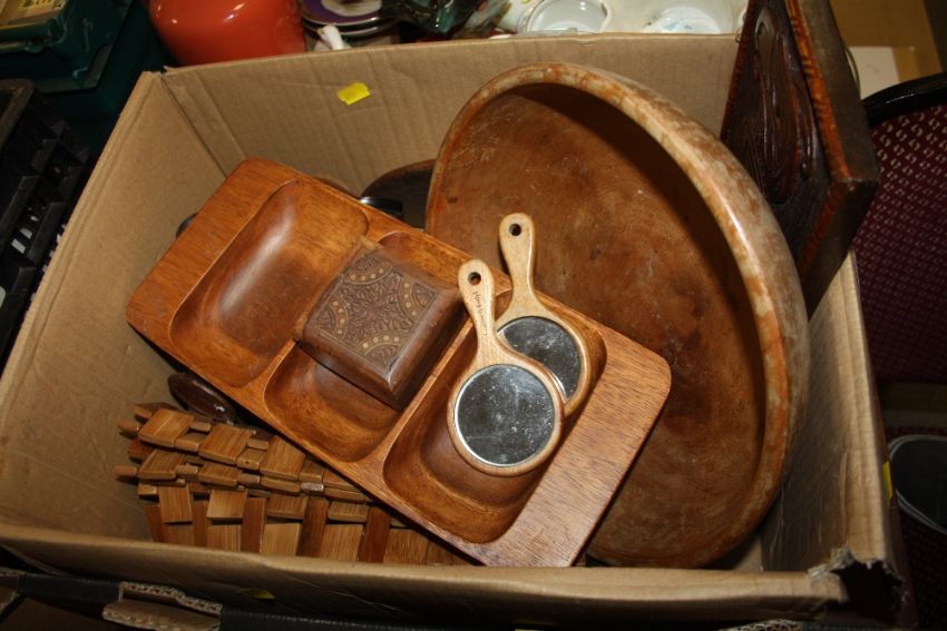 TWO BOXES OF ASSORTED TREEN TO INCLUDE TWIN HANDLED SERVING TRAYS AND FRUIT BOWL