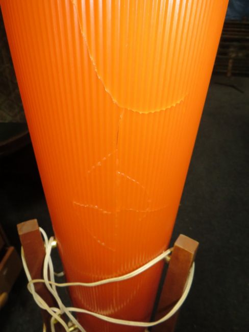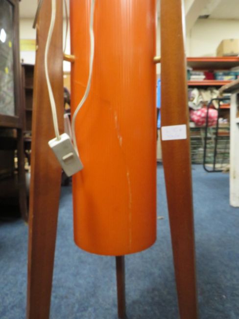 A RETRO TEAK FLOORSTANDING LAMP - THIS PLASTIC FUNNEL IS BADLY CRACKED IN TWO PLACES