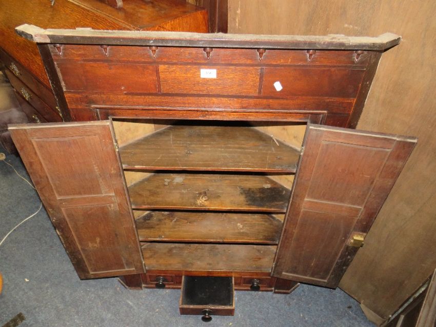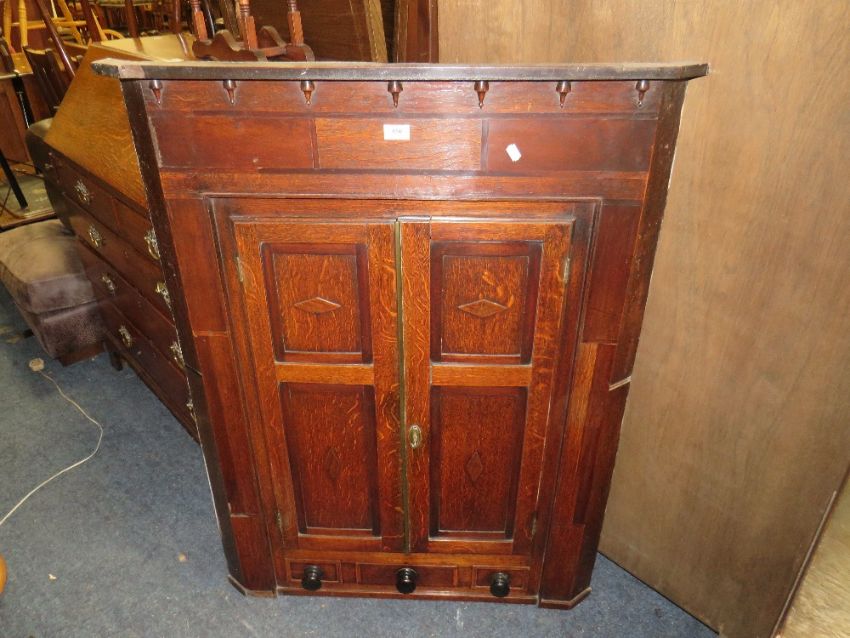 A 19TH CENTURY OAK AND MAHOGANY HANGING CORNER CUPBOARD H-117 W-90 CM