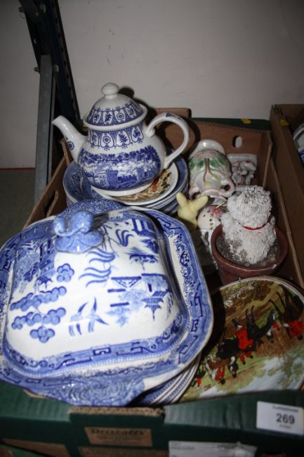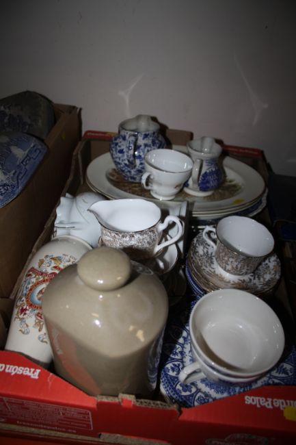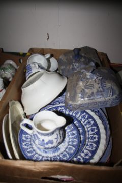 THREE TRAYS OF ASSORTED CERAMICS TO INCLUDE BLUE AND WHITE CHINA, VALE CHINA ETC.