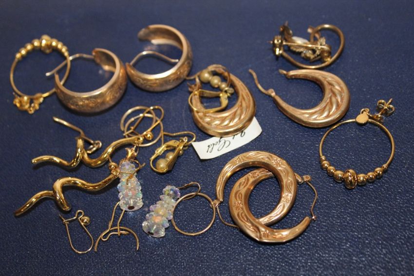 A BAG OF YELLOW METAL EARRINGS TO INCLUDE 9 CT GOLD EXAMPLES