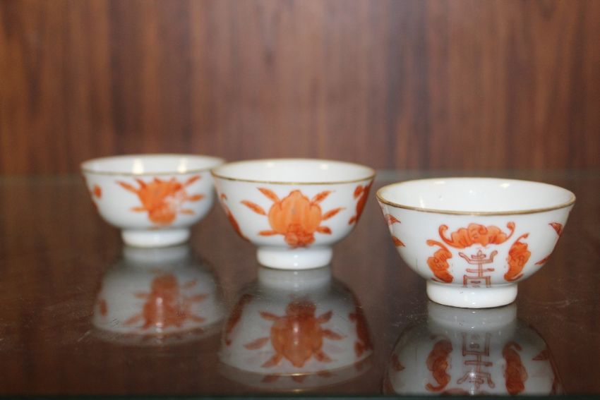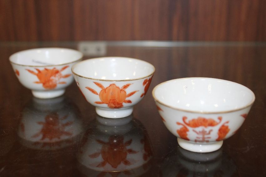 THREE SMALL CHINESE/ORIENTAL TEA BOWLS WITH ORANGE BACK STAMPS