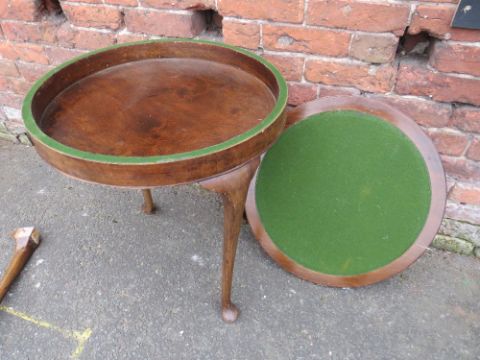 AN ART DECO STYLE WALNUT CIRCULAR GAMES TABLE ON FOUR CABRIOLE SUPPORTS - ONE LEG SEPARATE H-68 CM DIA. 60 CM