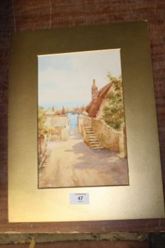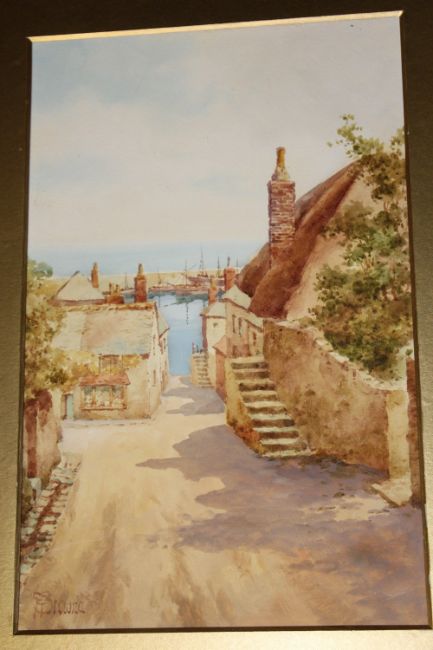 BROWNE (XX). British school, Cornish fishing village with sailing vessels in a harbour, singed lower left, watercolour, unframed, 28 x 17 cm