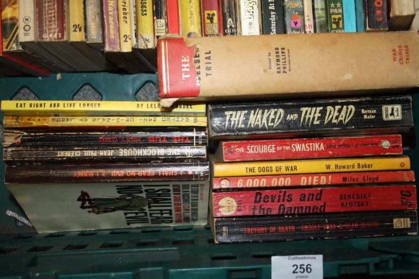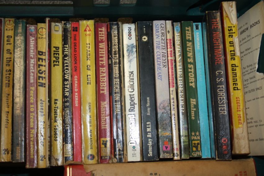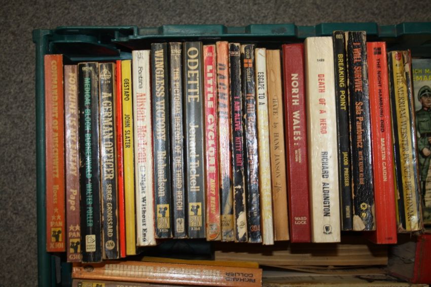 A COLLECTION OF VINTAGE BOOKS TO INCLUDE PAN BOOKS, WWII INTEREST, ETC. (PLASTIC TRAYS NOT INCLUDED)