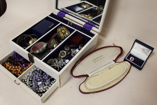 A QUANTITY OF ASSORTED COSTUME JEWELLERY TO INCLUDE A TISSOT PR50 LADIES WRISTWATCH, MCKINTOSH DESIGN COMPACT MIRROR, BROOCHES ETC.