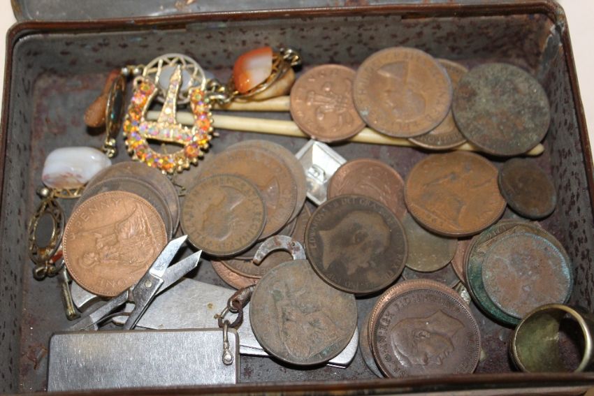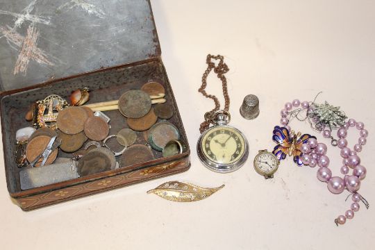 A TIN OF COLLECTABLES TO INCLUDE AN INGERSOLL POCKET WATCH, COINS AND BROOCHES ETC.