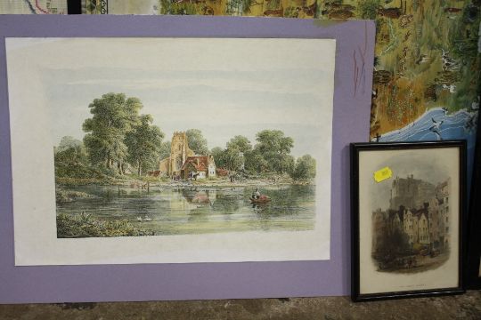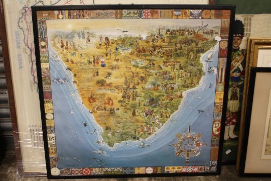 A QUANTITY OF PICTURES AND PRINTS TO INCLUDE A LARGE HAND STITCHED MAP OF SOUTH AFRICA TOGETHER WITH A PRINTED EXAMPLE, COLOURED ETCHING SIGNED MC ROBINSON, SIGNED PRINT ETC (7)
