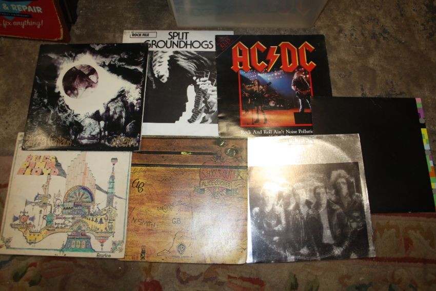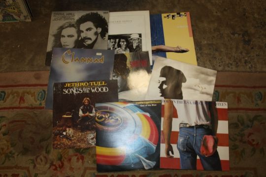 A BOX OF LP RECORDS ETC TO INCLUDE PINK FLOYD, ELO, QUEEN ETC.