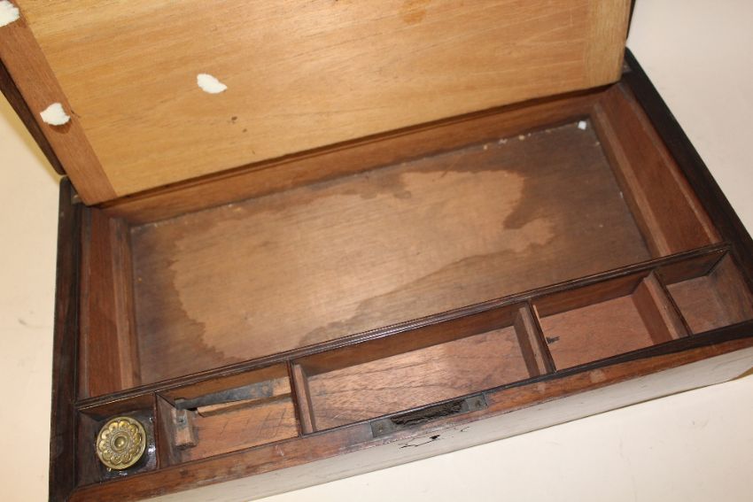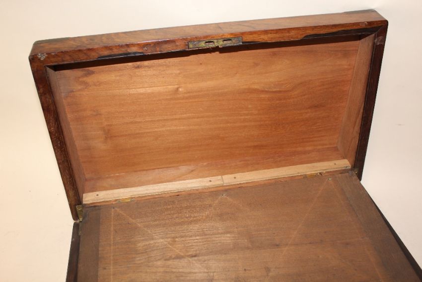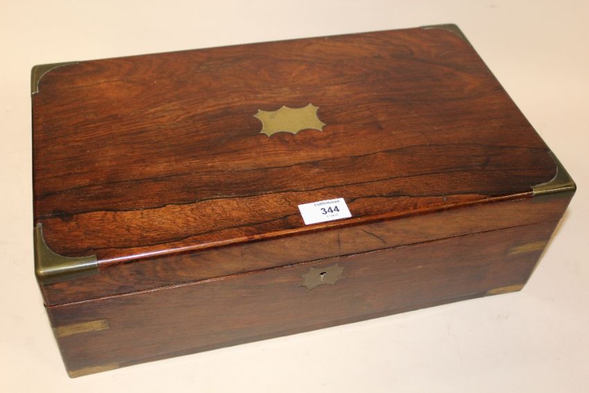 AN ANTIQUE BRASS CORNERED ROSE WOOD WRITING SLOPE, W 45 CM, D 25.5 CM, H 15 CM