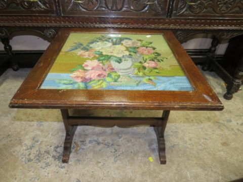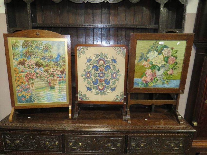 THREE VINTAGE OAK FRAMED TAPESTRY FIRE SCREEN ( ONE FOLDS UP )