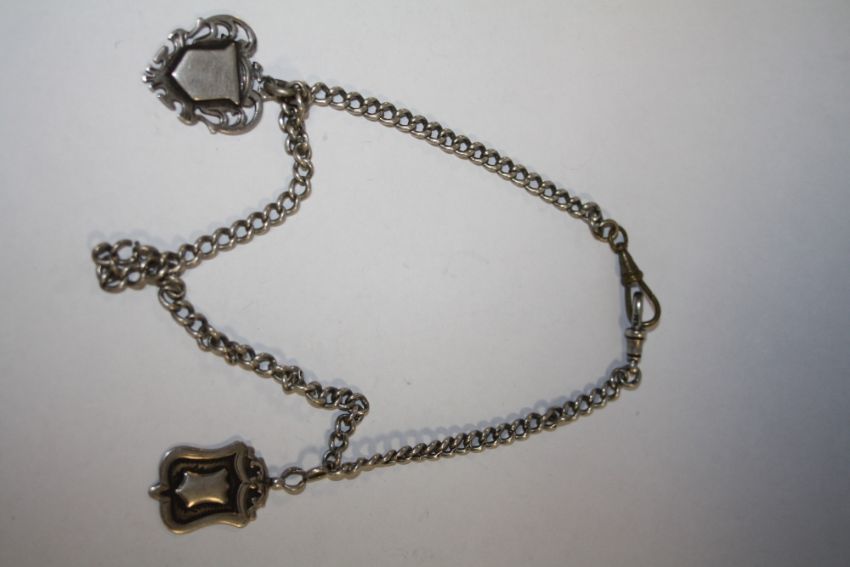 A HALLMARKED SILVER POCKET WATCH CHAIN WITH TWO HALLMARKED SILVER FOBS