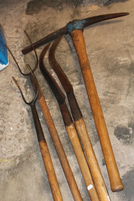 A SMALL SELECTION OF VINTAGE TOOLS TO INCLUDE A PICKAXE, HAY FORKS ETC PLUS A STRIMMER