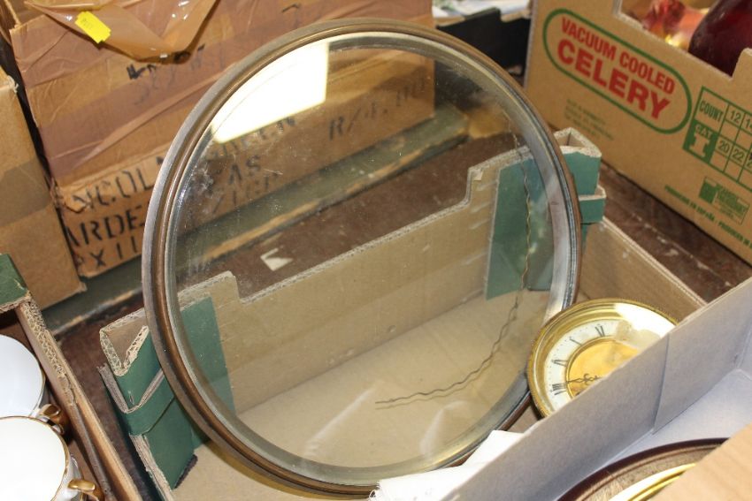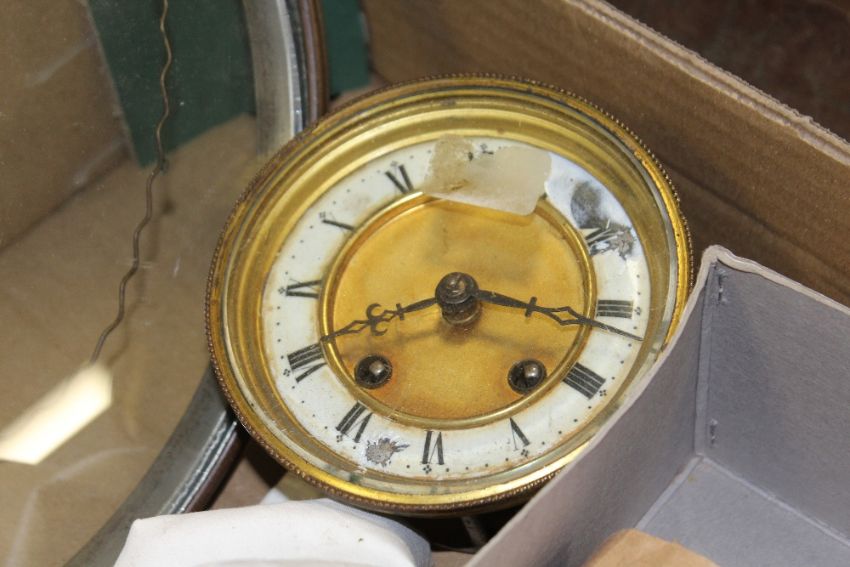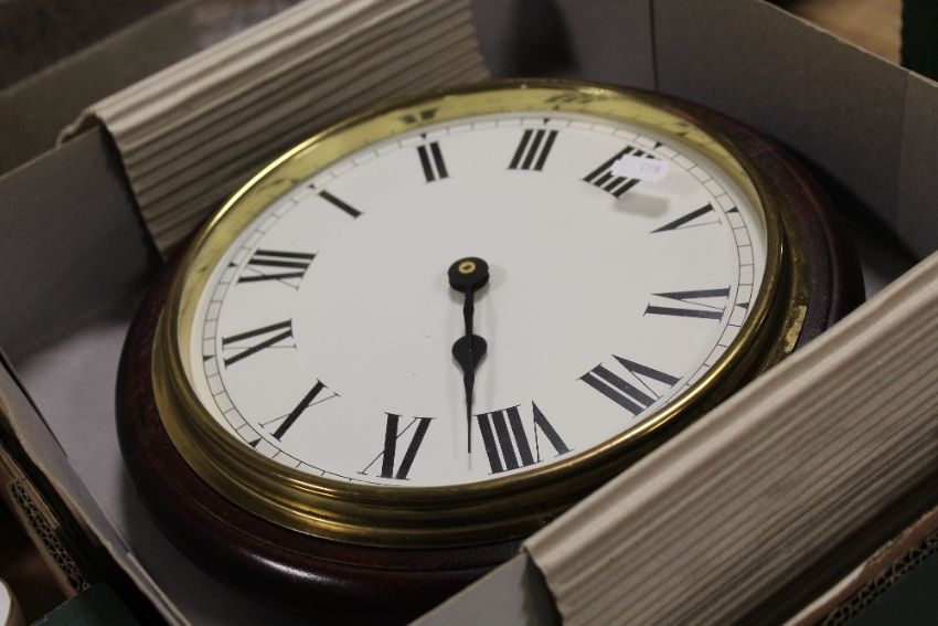 TWO CIRCULAR WALL CLOCKS TOGETHER WITH AN ANTIQUE CLOCK MOVEMENT ETC.