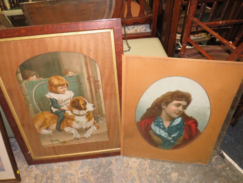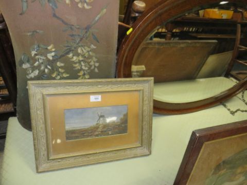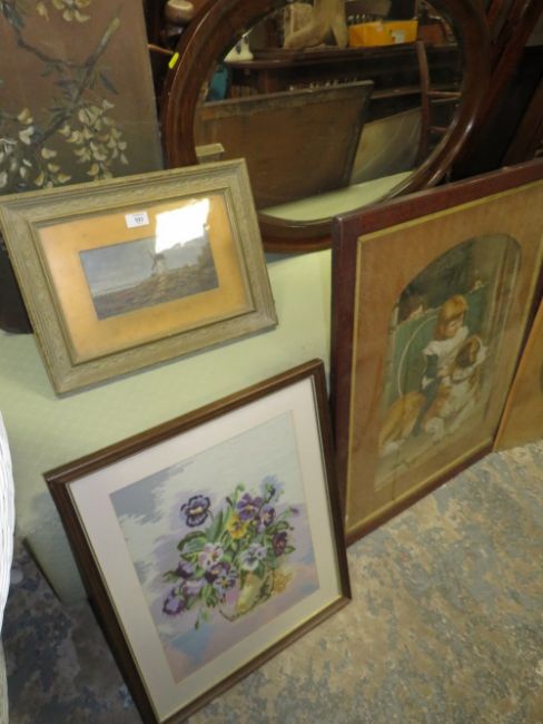 A COLLECTION OF ASSORTED VICTORIAN PICTURES TO INCLUDE A SMALL OIL OF A WINDMILL 11.5 X 23 CM AND A RELIGIOUS PORTRAIT PRINT ETC AND AN OVAL MIRROR (6)