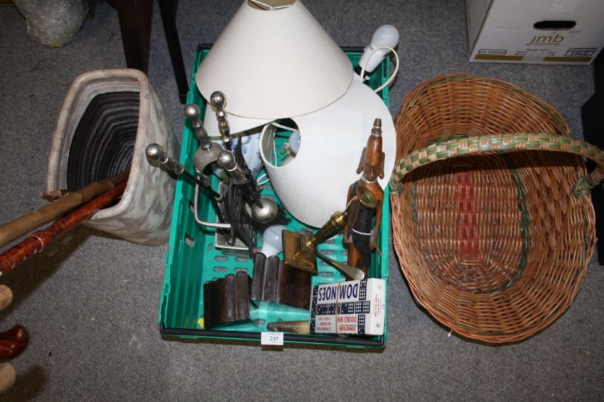A BOX OF COLLECTABLES TO INCLUDE A CHROME EFFECT COMPANION SET, WICKER BASKET, WALKING STICKS ETC.