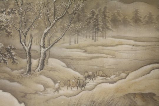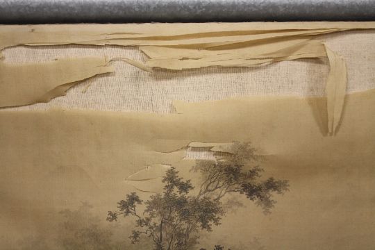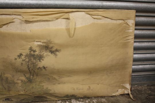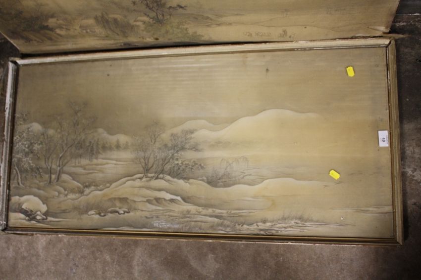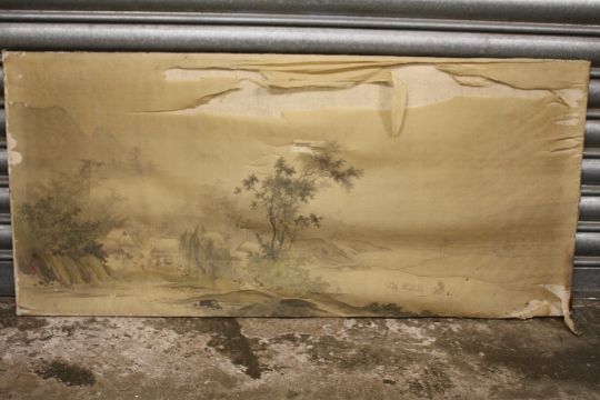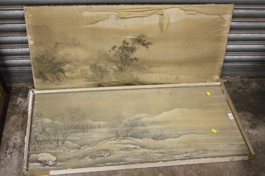 A PAIR OF ANTIQUE ORIENTAL WATERCOLOURS ON SILK DEPICTING LANDSCAPES A/F