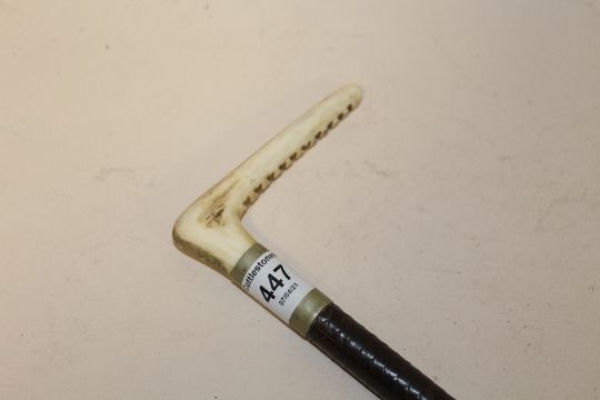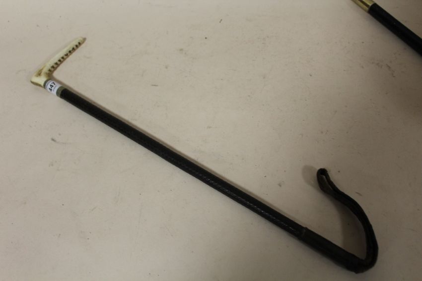 A HORN HANDLED VINTAGE LEATHER RIDING CROP