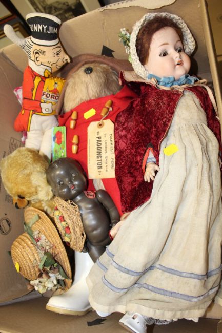 A COLLECTION OF VINTAGE DOLLS AND BEARS TO INCLUDE A BISQUE HEADED GERMAN ROLLER-EYED EXAMPLE, PADDINGTON BEAR ETC.