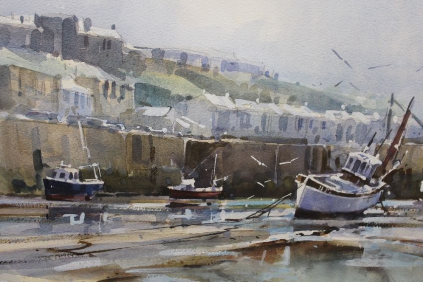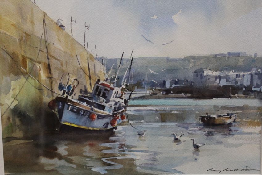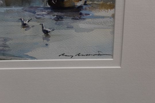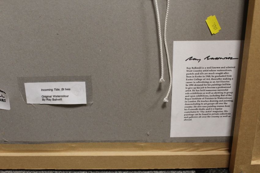 A PAIR OF PINE FRAMED AND GLAZED WATERCOLOURS DEPICTING HARBOUR SCENES WITH MOORED BOATS BY RAY BALKWILL SIZE - 36CM X 26CM