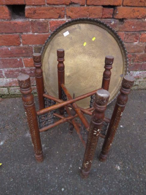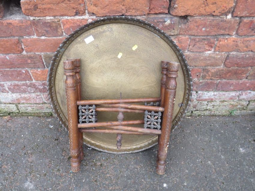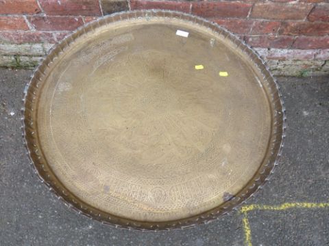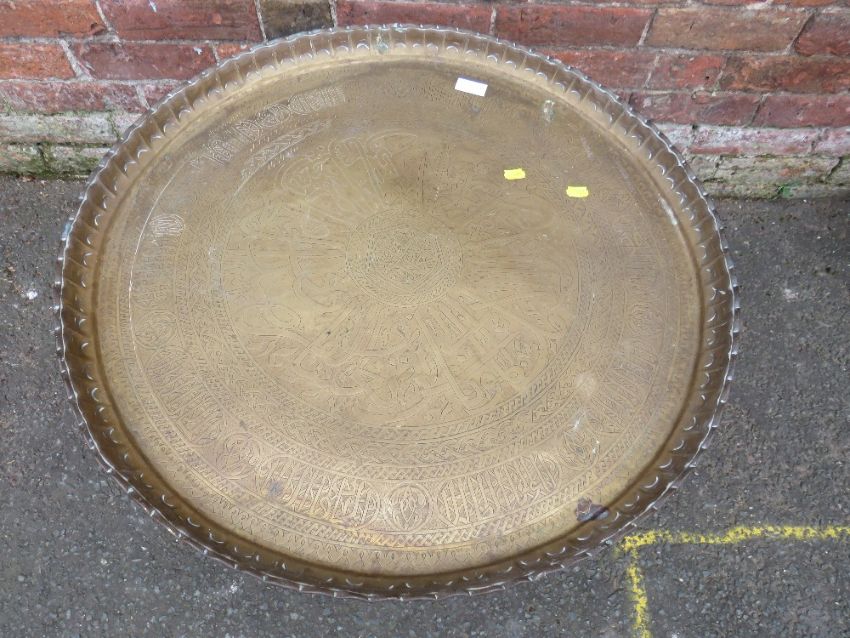 AN EASTERN BRASS TOP TABLE WITH TYPICAL INCISED DECORATION - FOLDING STAND H-53 CM DIA. 67 CM