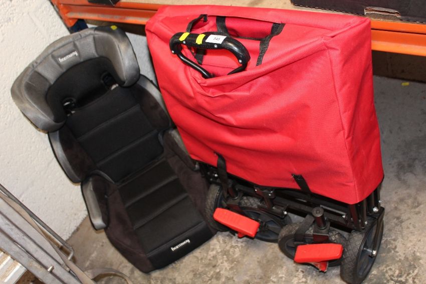 A FOLDOUT FESTIVAL STYLE TROLLEY TOGETHER WITH A CHILDS CAR SEAT