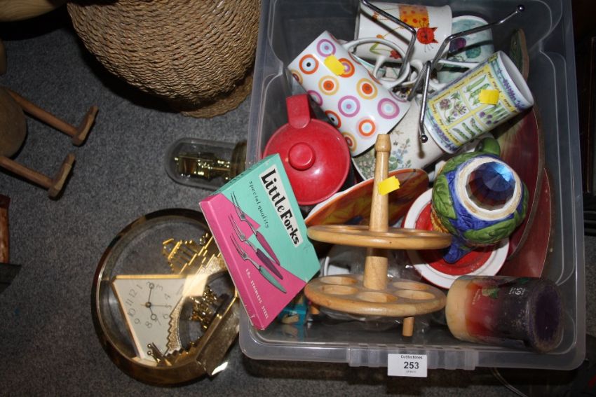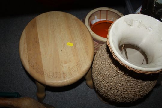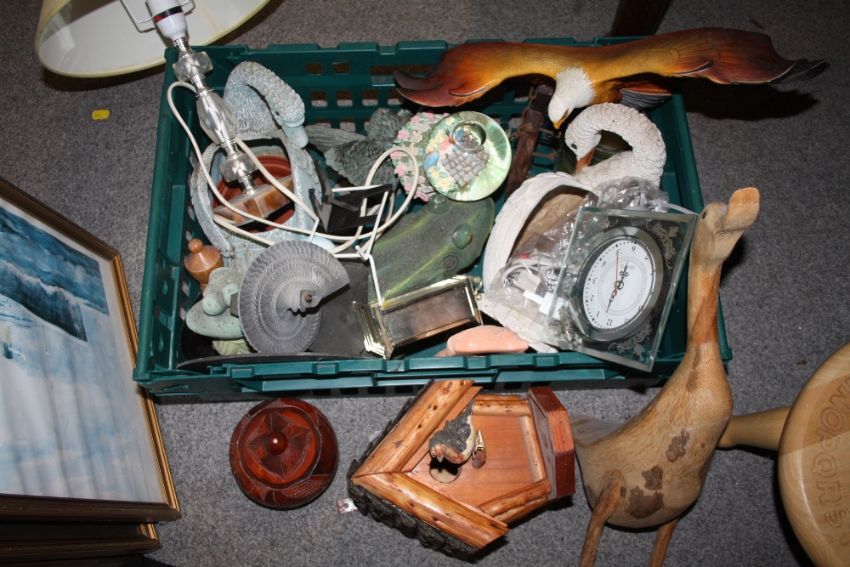 A QUANTITY OF HOUSEHOLD SUNDRIES TO INCLUDE A WOODEN STOOL, TABLE LAMP AND A WOODEN DUCK FIGURE (PLASTIC TRAYS NOT INCLUDED)