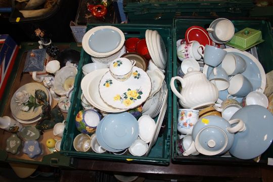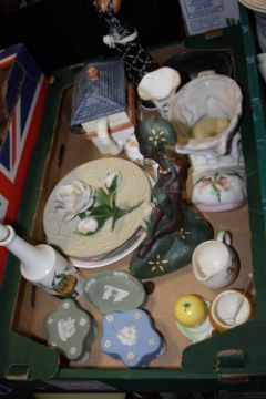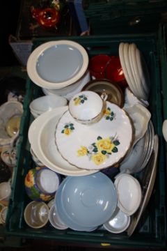 THREE TRAYS OF ASSORTED CHINA AND CERAMICS TO INCLUDE WEDGWOOD CHINA AND PORTMEIRION (PLASTIC TRAYS NOT INCLUDED)