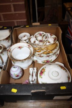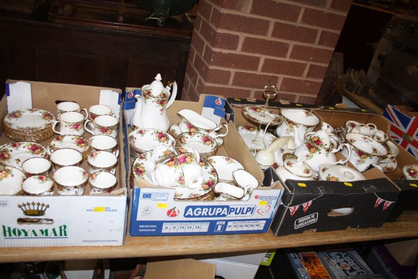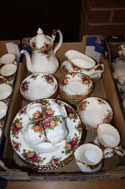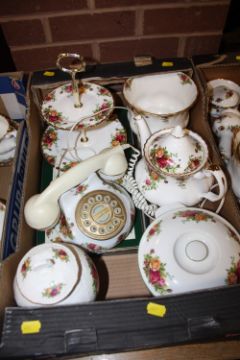 FOUR TRAYS OF ROYAL ALBERT OLD COUNTRY ROSES CHINA TO INCLUDE TEA AND COFFEE POTS, CAKE STAND, TELEPHONE ETC.