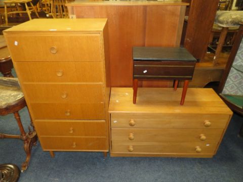 A MID CENTURY UTILITY OAK SIX DRAWER CHEST H-124 W-61 CM, RETRO SEWING BOX AND LOW CHEST (3)