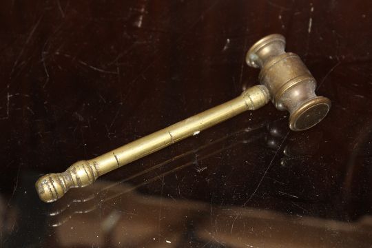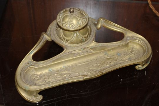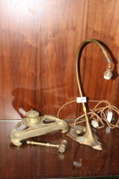 A BRASS DESK STAND TOGETHER WITH A BRASS GAVEL AND AN ART NOUVEAU STYLE TABLE LAMP (3)