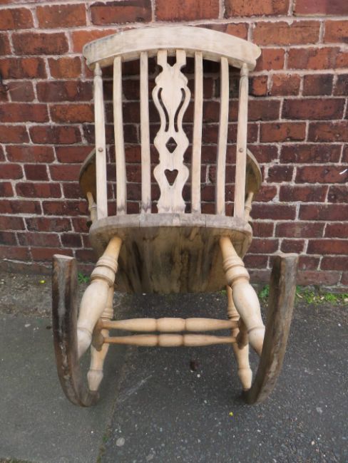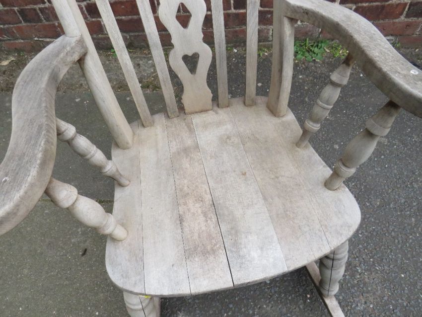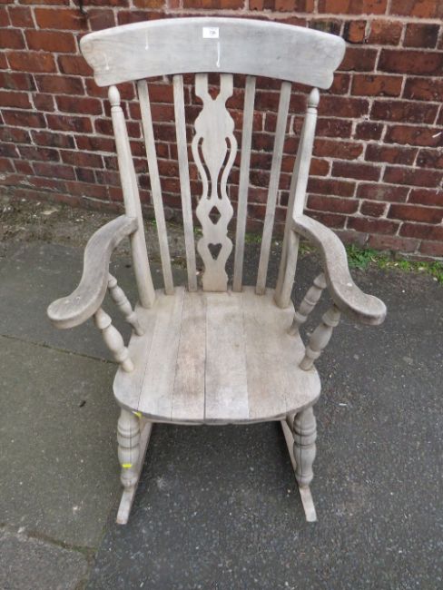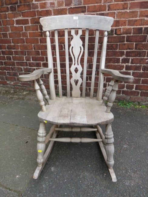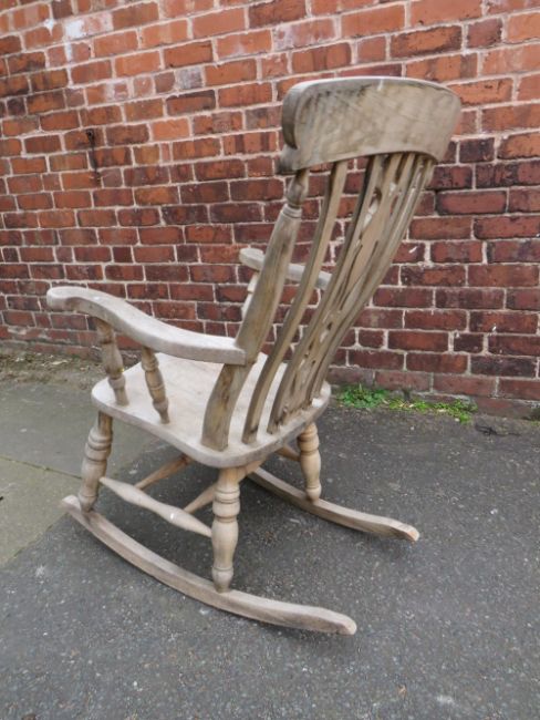 A LARGE STRIPPED WINDSOR ROCKING ARMCHAIR