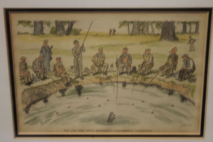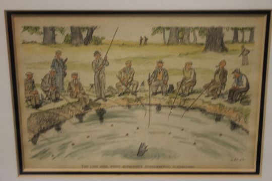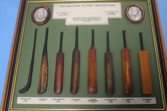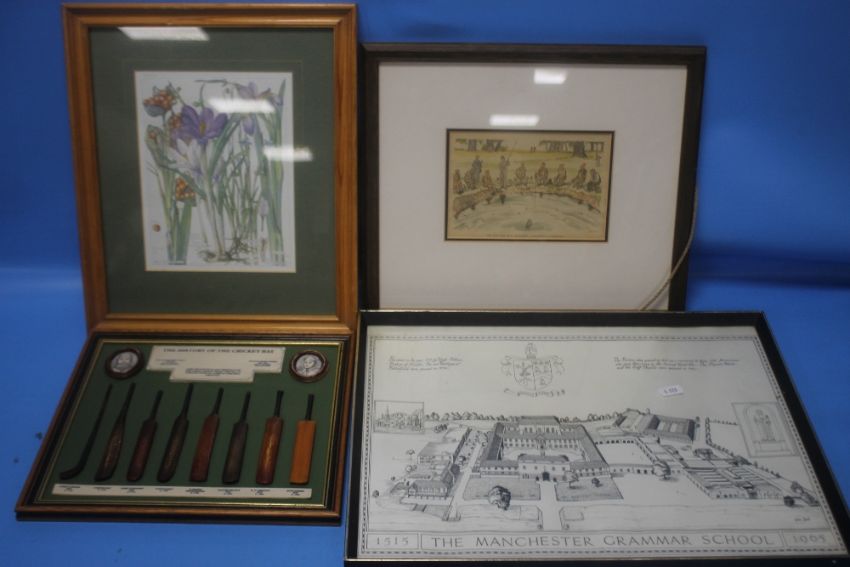 A COLLECTION OF ASSORTED PICTURES TO INCLUDE 'THE LAST FISH BEING HOPELESSLY OUTNUMBERED, SURRENDERS' AND 'THE HISTORY OF THE CRICKET BAT' MONTAGE 1/7TH REPLICA OF MCC COLLECTION BATS ETC. (4)