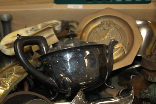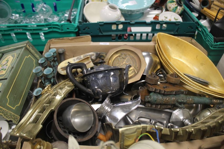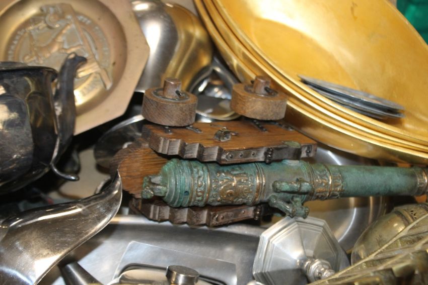 A BOX CONTAINING METALWARE TO INCLUDE VALOR BRASS FIRE FRONT, CAST IRON BARREL CANNON, PAIR OF CANDLESTICKS, HORN BOAT, COFFEE SET ETC.
